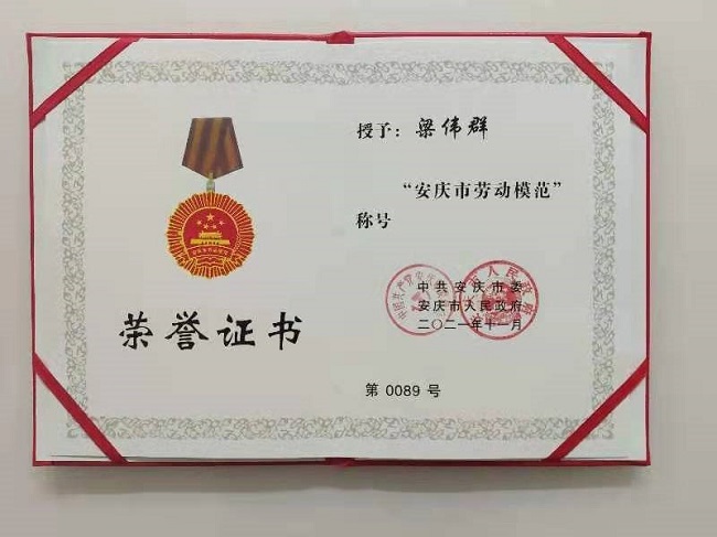 近日,在市委、市政府召開(kāi)的市勞動(dòng)模范、先進(jìn)工作者和先進(jìn)集體表彰大會(huì)上,公司員工梁偉群被授予“安慶市勞動(dòng)模范”。