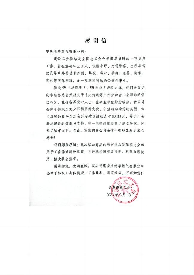 為進一步傳播慈善文化,弘揚傳統(tǒng)美德,推動戶外勞動者工會驛站建設(shè)。在全國第八個“中華慈善日”來臨之際,安慶港華高度重視,認真部署,依法組織,在公司開展“慈善日捐款”活動。