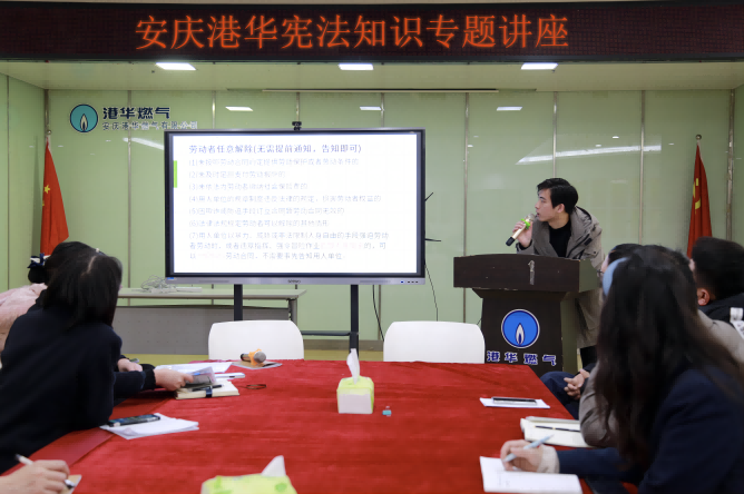 組織20余名員工代表開展憲法專題講座,以《中華人民共和國憲法》《勞動法》《城鎮(zhèn)燃氣管理條例》及誠信合規(guī)相關法律法規(guī)的解讀和案例詳解為主要內容,進行法律宣講。