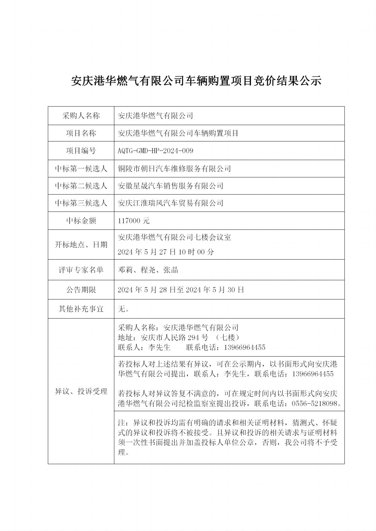 安慶港華燃?xì)庥邢薰拒囕v購置項目競價結(jié)果公示