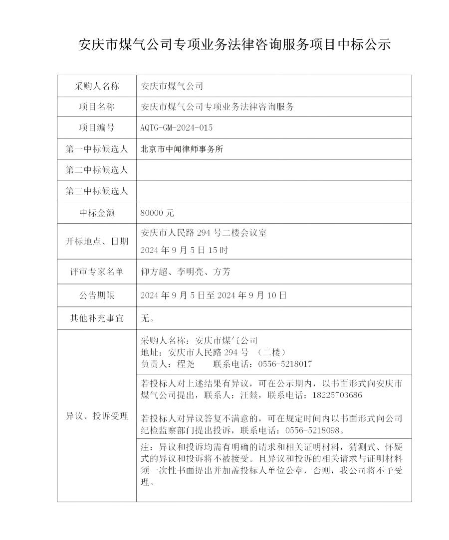 安慶市煤氣公司專項業(yè)務法律咨詢服務項目中標公示