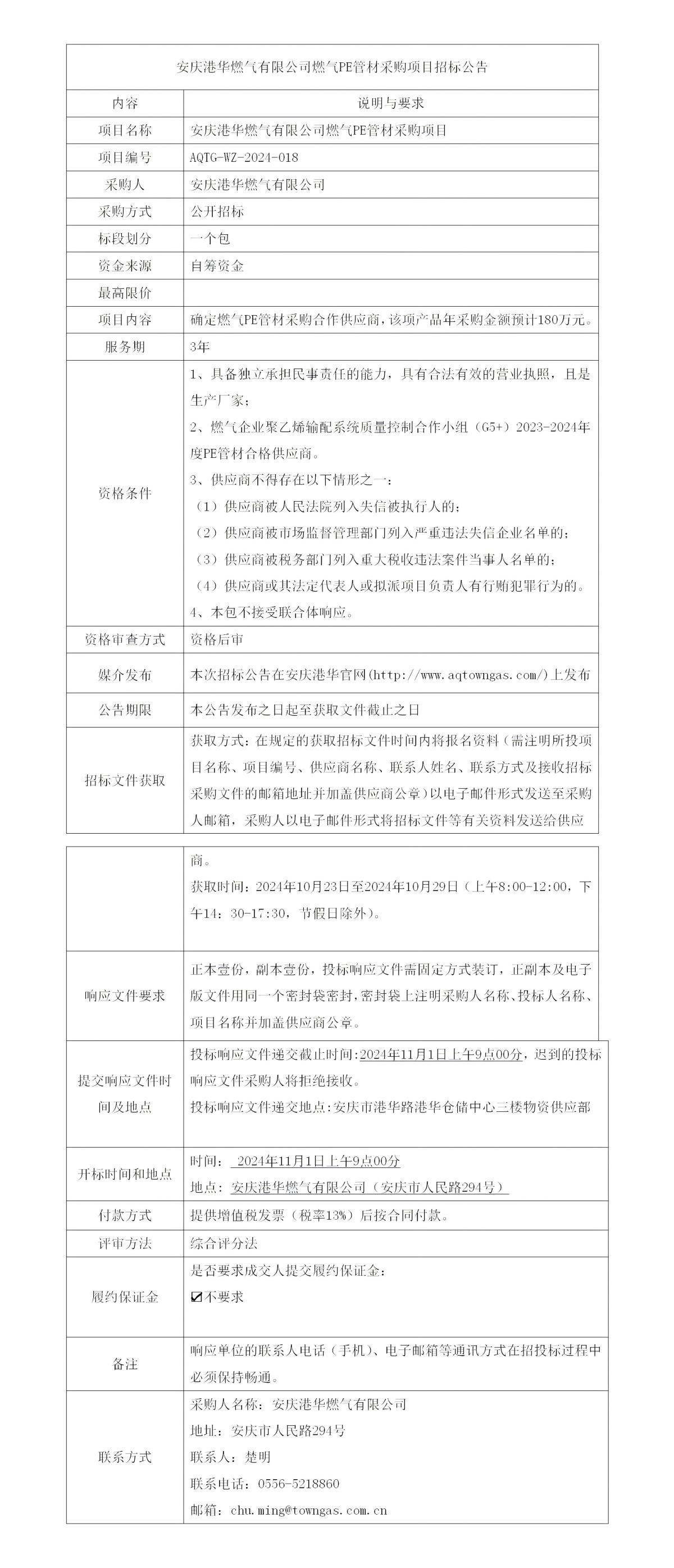 安慶港華燃氣有限公司燃氣PE管材采購項目招標公告