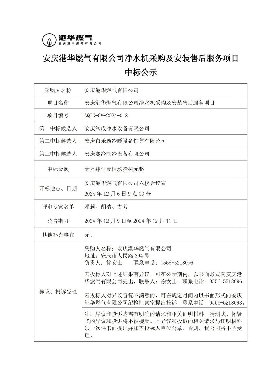 安慶港華燃?xì)庥邢薰緝羲畽C(jī)采購及安裝售后服務(wù)項(xiàng)目中標(biāo)公示
