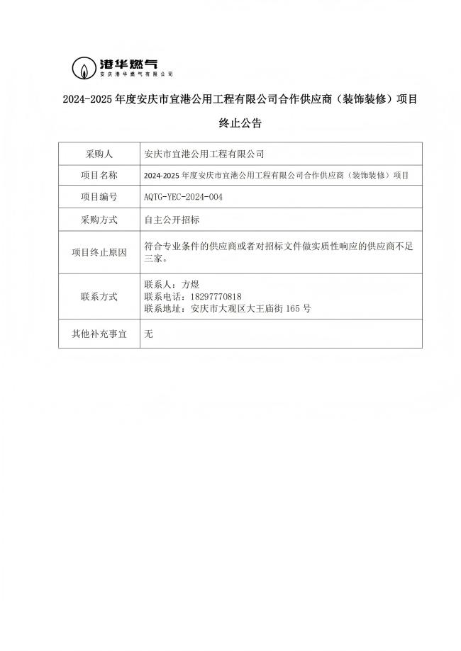 2024-2025 年度安慶市宜港公用工程有限公司合作供應(yīng)商(裝飾裝修)項目終止公告