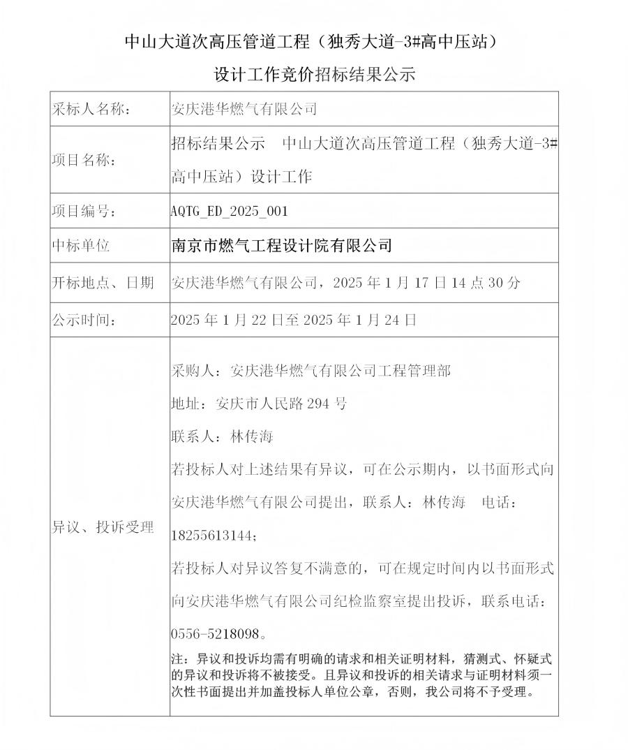 中山大道次高壓管道工程(獨(dú)秀大道-3#高中壓站)設(shè)計(jì)工作競(jìng)價(jià)招標(biāo)結(jié)果公示