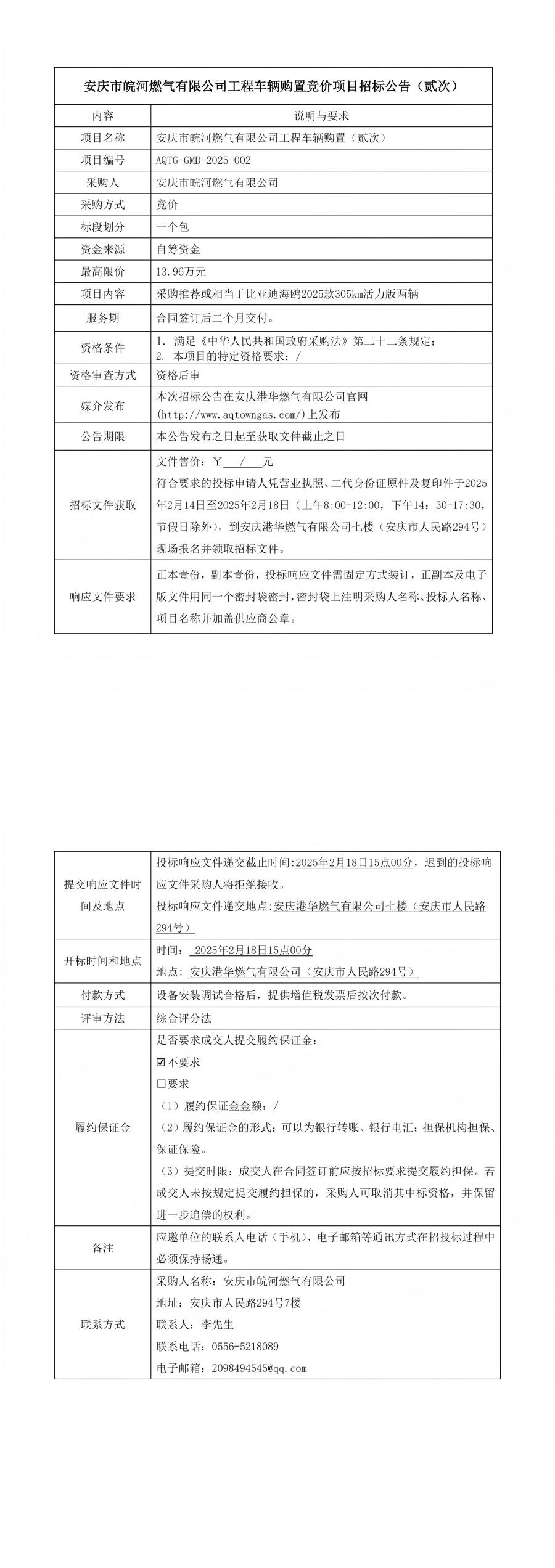 安慶市皖河燃?xì)庥邢薰竟こ誊囕v購置競價(jià)項(xiàng)目招標(biāo)公告(貳次)