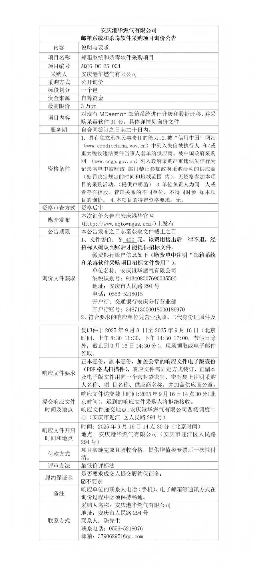 安慶港華燃?xì)庥邢薰距]箱系統(tǒng)和殺毒軟件采購(gòu)項(xiàng)目詢價(jià)公告