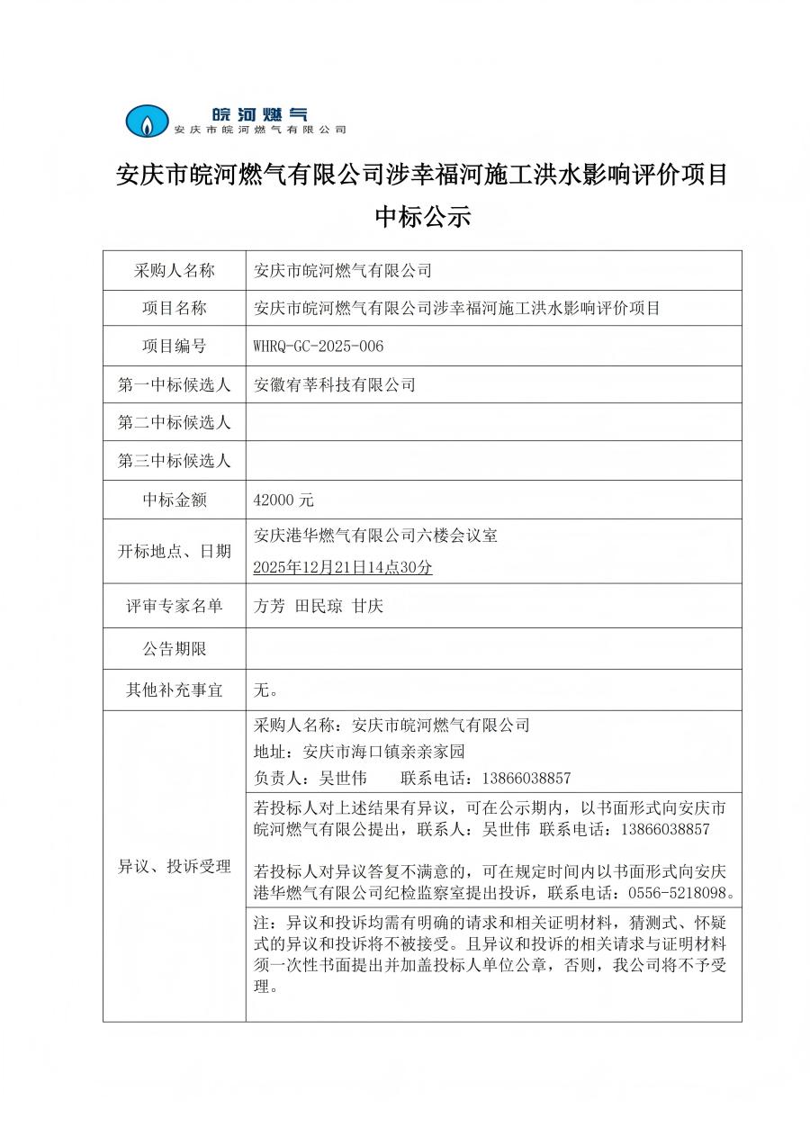 安慶市皖河燃?xì)庥邢薰旧嫘腋:邮┕ず樗绊懺u價(jià)項(xiàng)目中標(biāo)公示