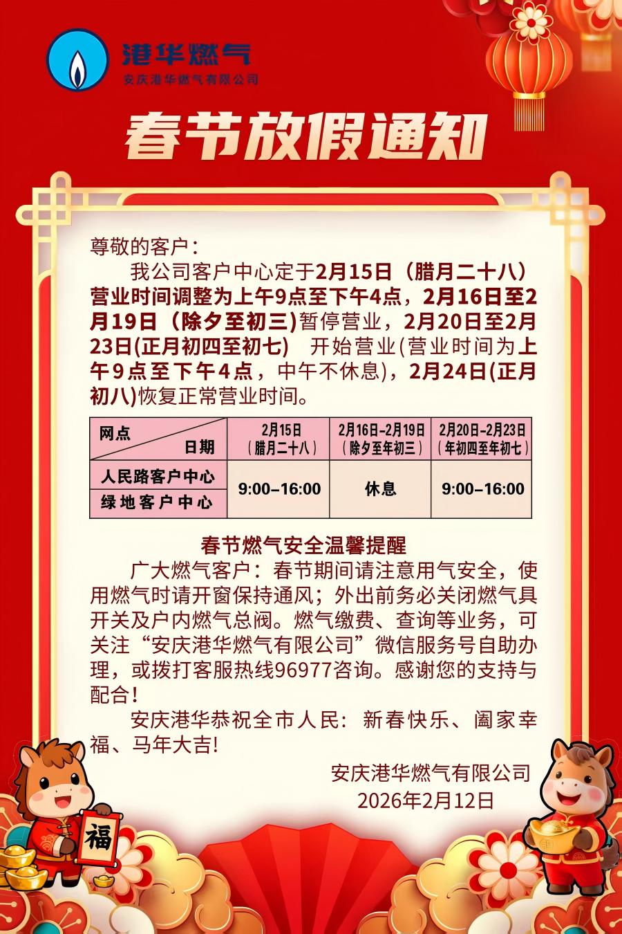 安慶港華燃?xì)饪蛻糁行拇汗?jié)放假通知